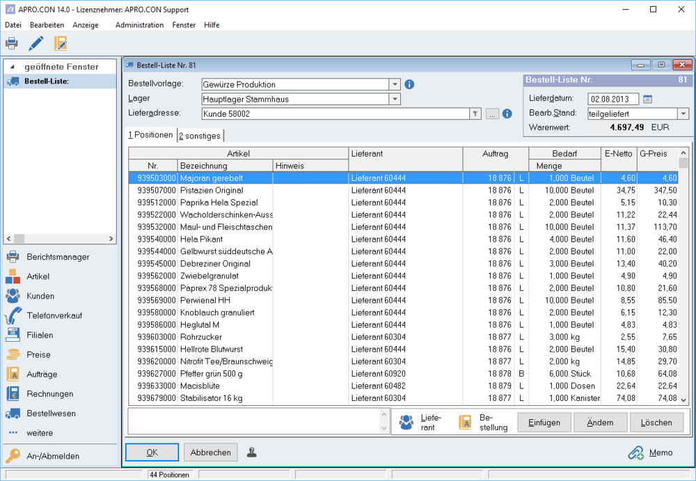 APRO.CON ist eine auf mittelständische Metzgereien und Lebensmittelbetriebe abgestimmte Warenwirtschaftssoftware, die durch ihren modularen Aufbau präzise an die Anforderungen Ihres Unternehmens angepasst werden kann. Ob im Bestellwesen, im Wareneingang, in der Produktion und Kalkulation, im Abverkauf oder bei der Verwaltung von Kunden- und Lieferantendaten: APRO.CON legt den Grundstein für Transparenz und Nachvollziehbarkeit in Ihrem Unternehmen und ermöglicht den Anwendern die umfangreiche Auswertung, Planung und Steuerung der Betriebsabläufe.